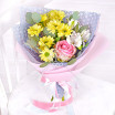 Альстромерия белая и розовая- 1шт., роза розовая – 1шт., хризантема желтая –1шт., эвкалипт-1шт., упаковка,лента.